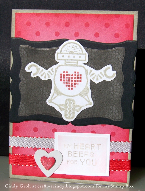 I have a new card using myStamp box stamps that I want to share today. I should have used this little robot guy for Valentine cards but missed the boat on that one. This would be an adorable anniversary card or just one to say I love you.