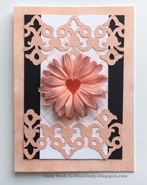 I thought it needed a little bit more so I dug around in my goodies and came across the Hero Arts stamped love flower on a circle die cut. I added a scallop punch (Stampin Up) out of Die Cuts with a View patterned paper behind it. I set a purple-ish-colored eyelet in the center and adhered it down.