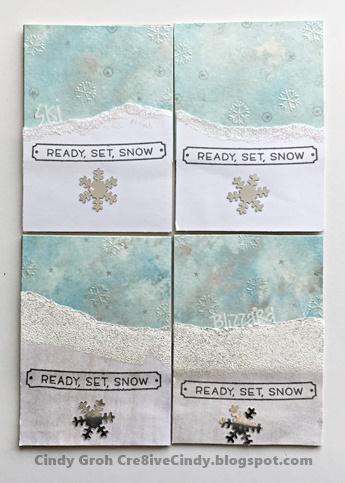 On the bottom row of ATC's, I combined white paint by Ranger with Perfect Pearls and painted it onto white cardstock. I tore the edge of the white paper and smeared Versa Mark ink on that torn edge. I heat embossed with white glitter powder by Stampendous.