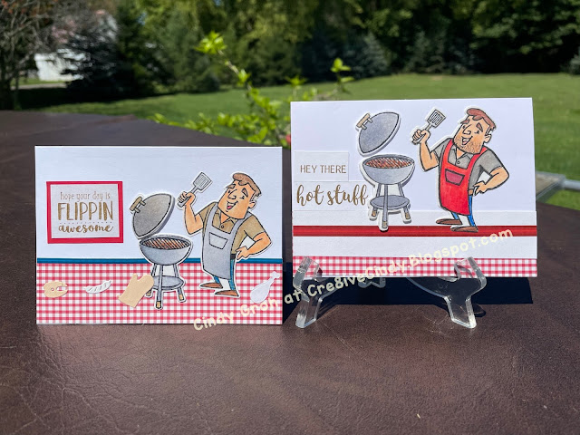 The golf bag stamp is by Great Impressions. Colored in with Peerless Watercolors. Die-cut from an eBay die and inked inside with distress ink. Border stamp by TPC Studio that was white heat embossed. Embossing folder by Cuttlebug that was inked with distress ink on an ombré of blues. All of this is on a kraft colored cardstock
